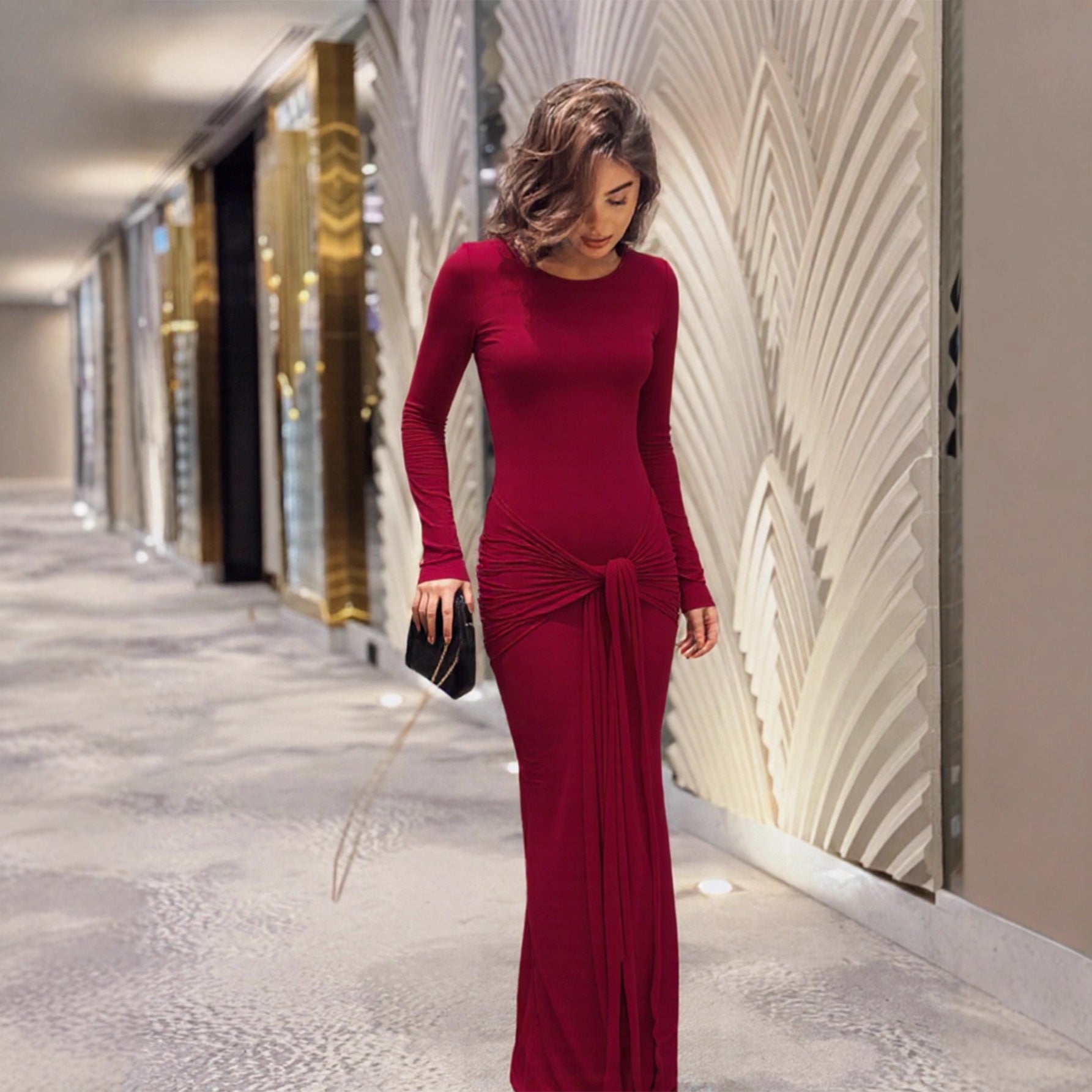Womens Long-sleeve Body-hugging Crew-neck Fashionable Sheath Dress